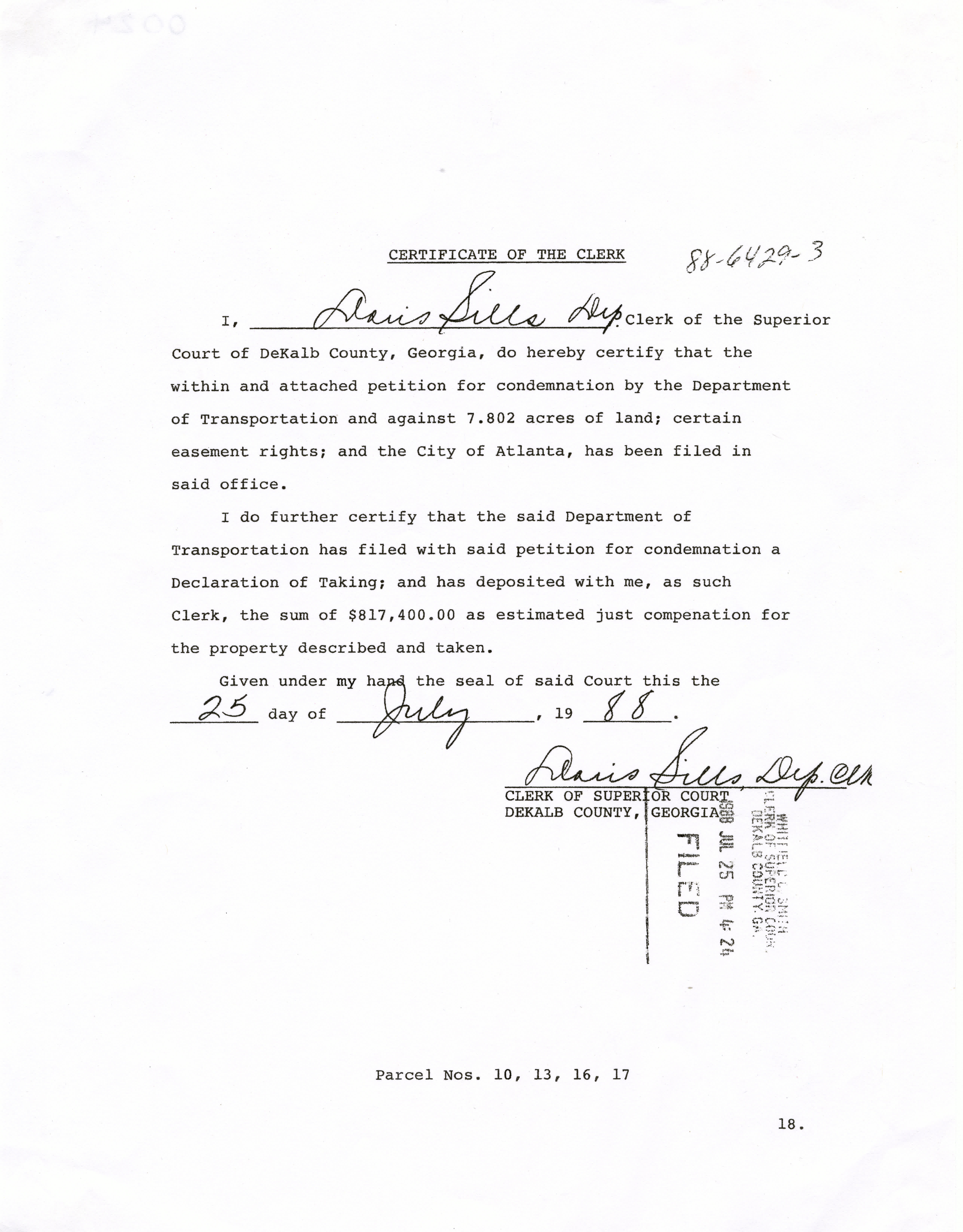 Certificate of the Clerk - Notice of Condemnation of Land in DeKalb County - 07/25/88, 1988-07-25, CAUTION Inc. (Atlanta Road Fight) Collection, 1971-2021 SC/R/002, Department of Museums, Archives, and Rare Books, Kennesaw State University