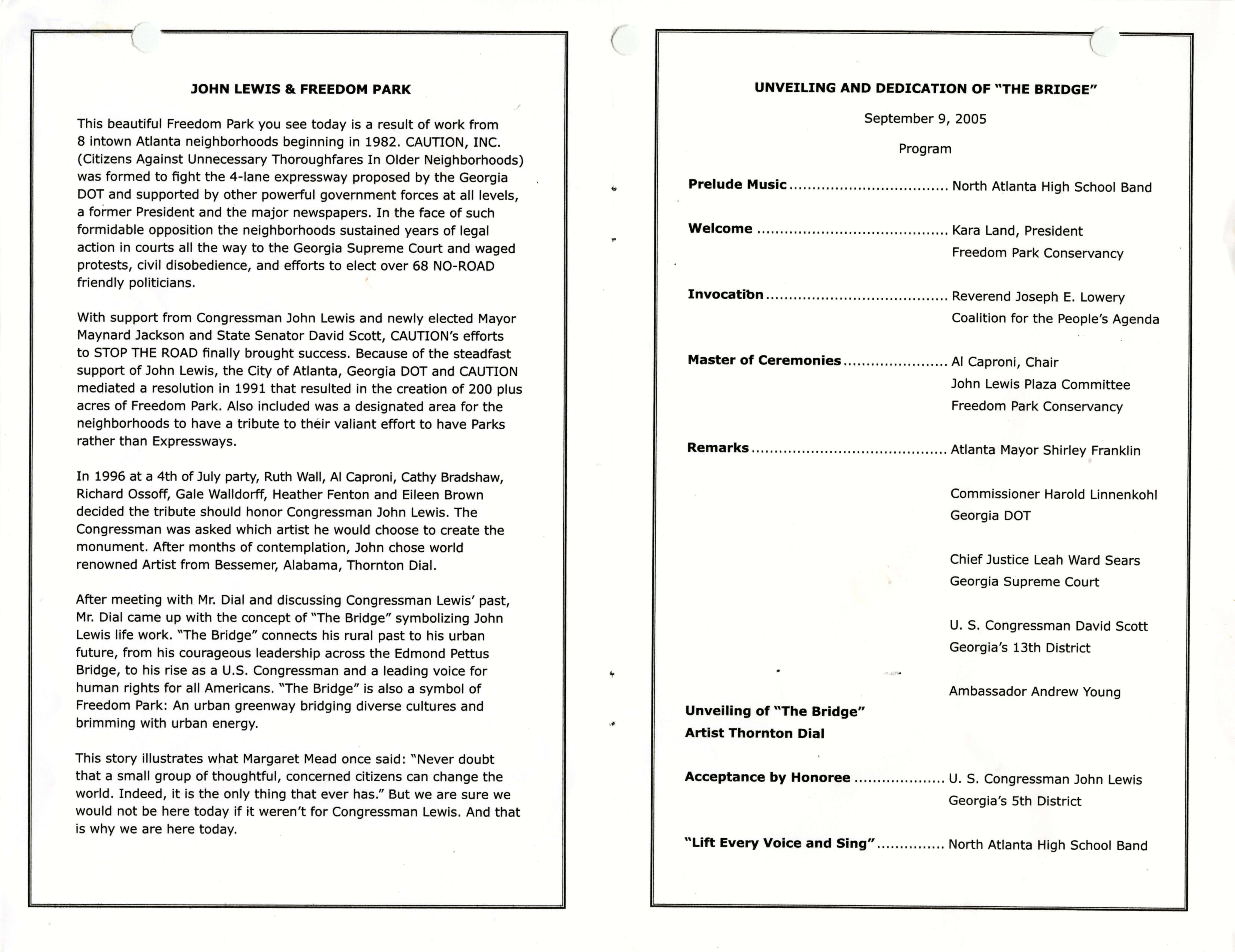 In 2005, after years of fundraising, Thornton Dial's "The Bridge" was dedicated in honor of John Lewis. This program is from the dedication, and features a list of donors.