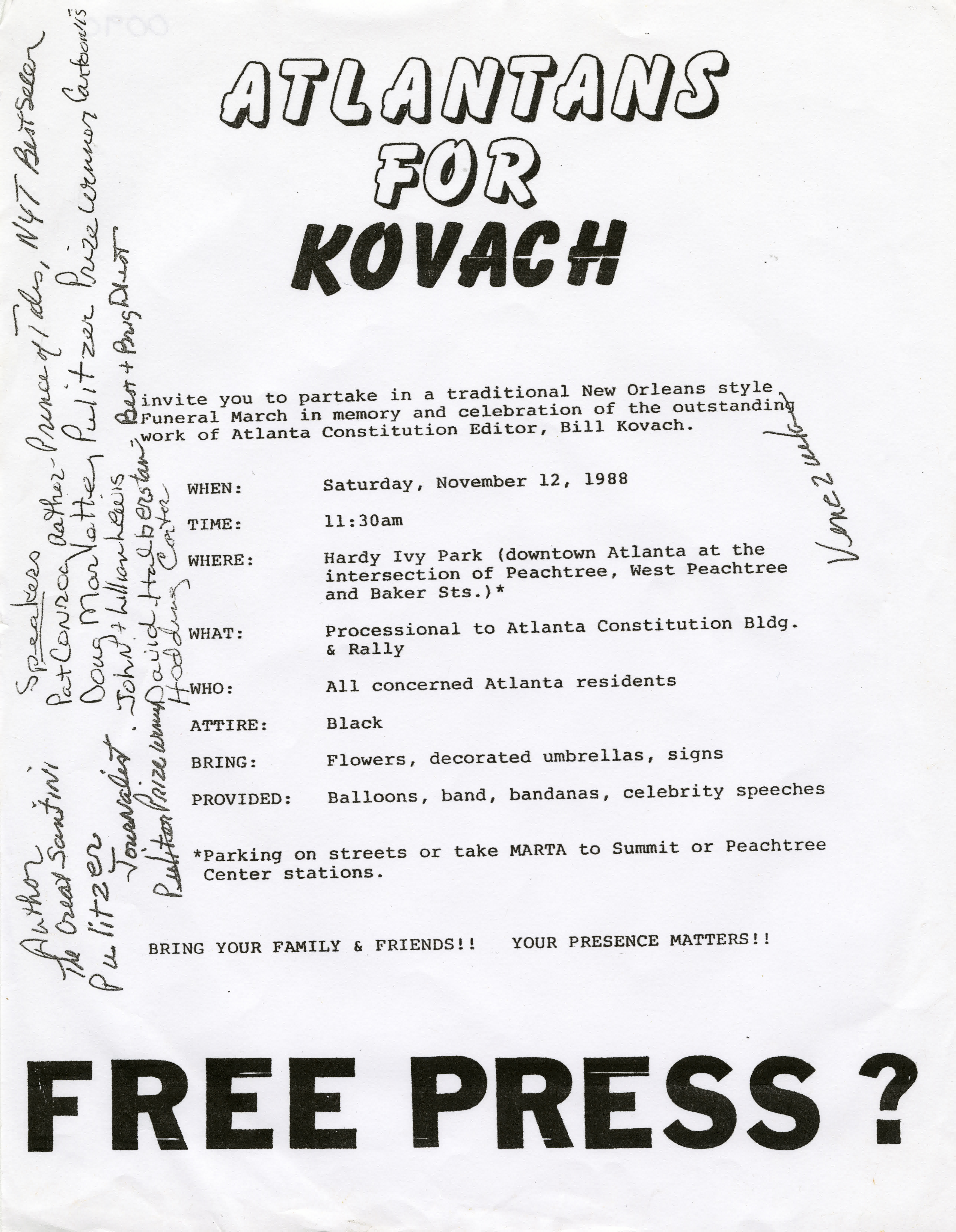 This Atlantans for Kovach flyer promotes a protest at Hardy Ivy Park caused by the resignation of Bill Kovach of the Atlanta Constitution.