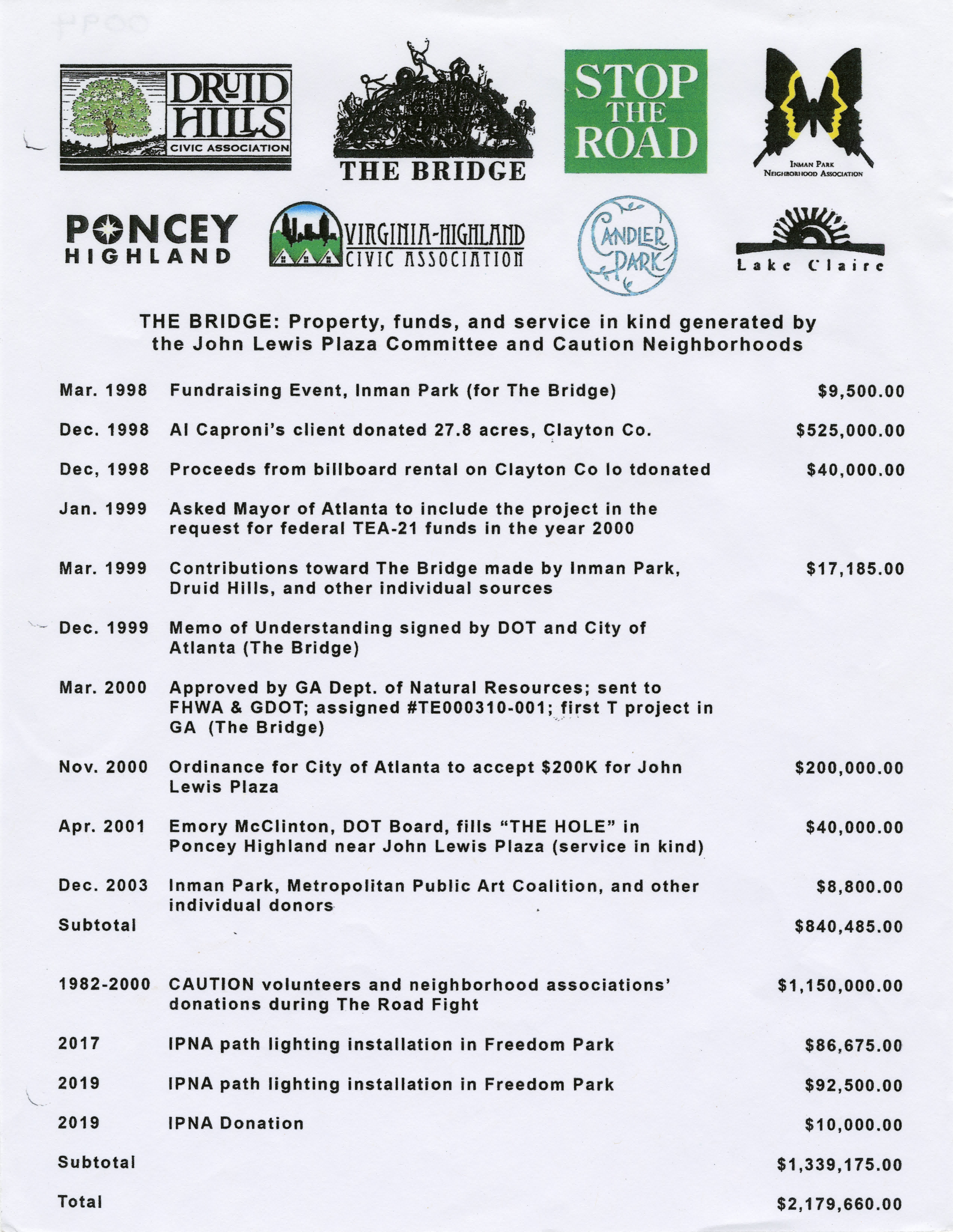 This document shows the money raised for "The Bridge," a sculpture honoring John Lewis in Freedom Park.