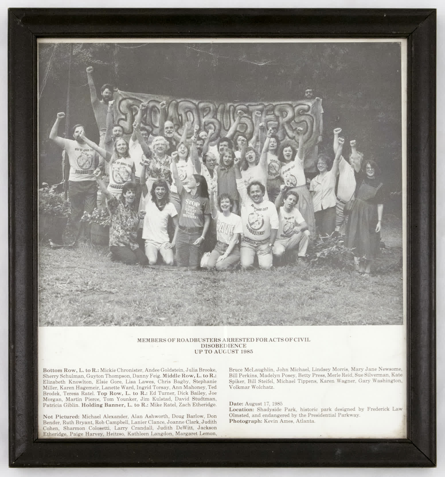 Members of Roadbusters Arrested for Acts of Civil Disobedience Up to August 1985 [framed], 1905-06-07, CAUTION Inc. (Atlanta Road Fight) Collection, 1971-2021 SC/R/002, Department of Museums, Archives, and Rare Books, Kennesaw State University